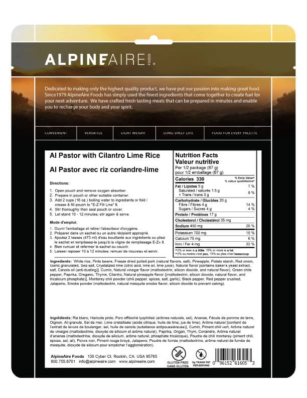 - Ingredients: white rice, pinto beans, freeze dried pulled pork (natural flavors, salt), pineapple, potato starch, red onion, garlic granulated, sea salt, crystalized lime (citric acid, lime oil, lime juice), natural flavor [contains baker’s yeast extract, salt, canola oil (anti-dusting)], cumin, natural vinegar flavor (maltodextrin, silicon dioxide, and natural flavor), green chile pepper, paprika, oregano, thyme, cilantro, natural pineapple flavor [(maltodextrin, silicon dioxide, natural flavor, and tricalcium phosphate)], monterey chili powder (chili pepper, spices, salt, garlic), black pepper, red pepper crushed, jalapeno, smoke powder (maltodextrin, natural mesquite smoke flavor, silicon dioxide to prevent caking)