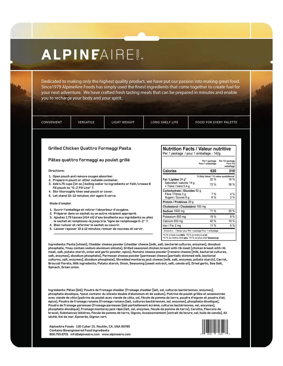 Savory 4-cheese pasta loaded with moist grilled chicken to help you refuel after a hard day on the trail.