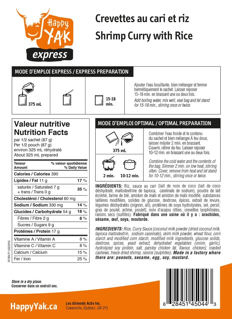 - Ingredients: rice, curry sauce /coconut milk powder (dried coconut milk, tapioca maltodextrin, sodium caseinate), skim milk powder, wheat flour, corn starch and modified corn starch, modified milk ingredients, glucose solids. dextrose, spices, yeast extract dehydrated vegetables (onion, garlic), hydrolyzed soy protein, salt, parsley chicken fat flavour chicken/, roasted cashews, freeze dried shrimp, raisins (sulphites)