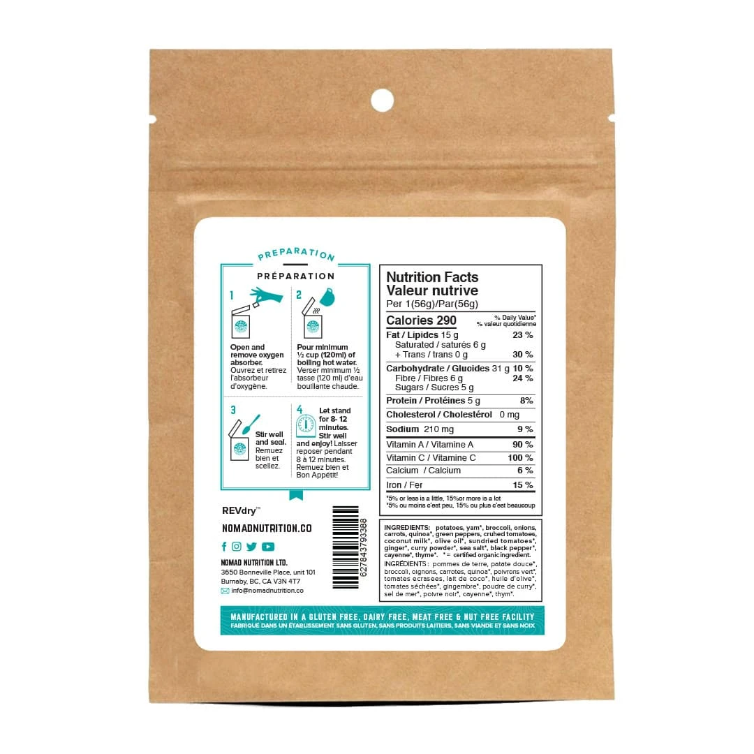 - Ingredients: potatoes, onions, carrots, coconut milk, quinoa, butternut squash, yam, cauliflower, broccoli, red peppers, crushed tomatoes, olive oil, sundried tomatoes, garlic, ginger, spices and sea salt