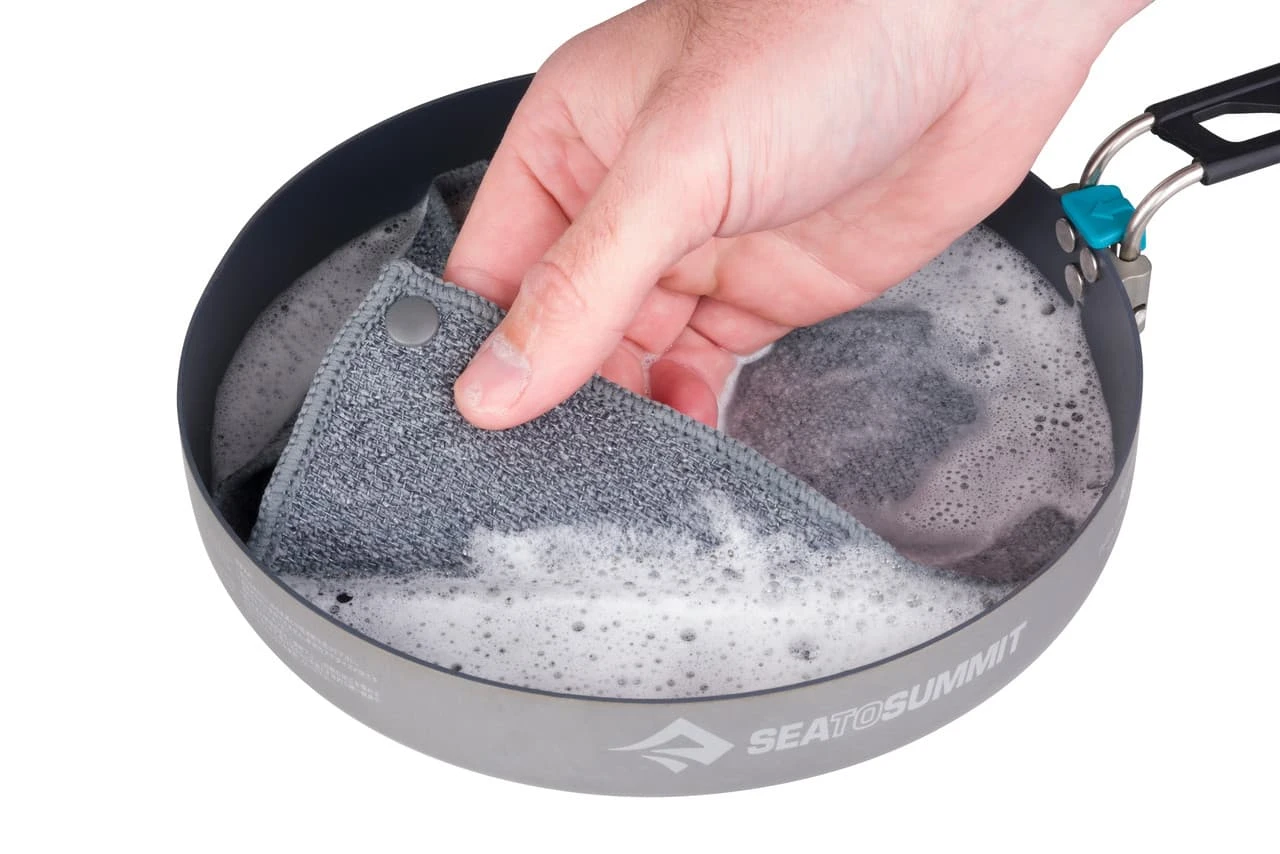 - Includes folding nylon spatula and serving spoon, 3 leakproof oil or condiment bottles, Wilderness Wash bottle and pot scrubber, wash cloth, towel, and hanging nylon storage pouch