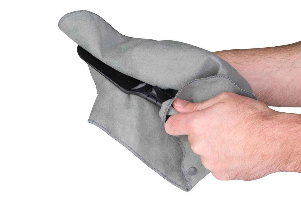 - Pouch has pockets for each item and 2 extras, and snaps to hang cloth and towel